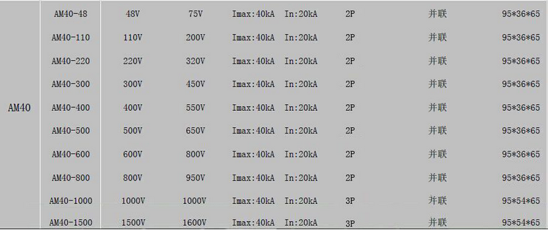 ,型号根据工作电压选择,一般为380V三相电或220V单相单。根据单三相选择不同的交流防雷器。目前分布式屋顶光伏发电系统里面用的交流防雷器主要是三相电源防雷器型号AM40A(380V,4P,40kA),